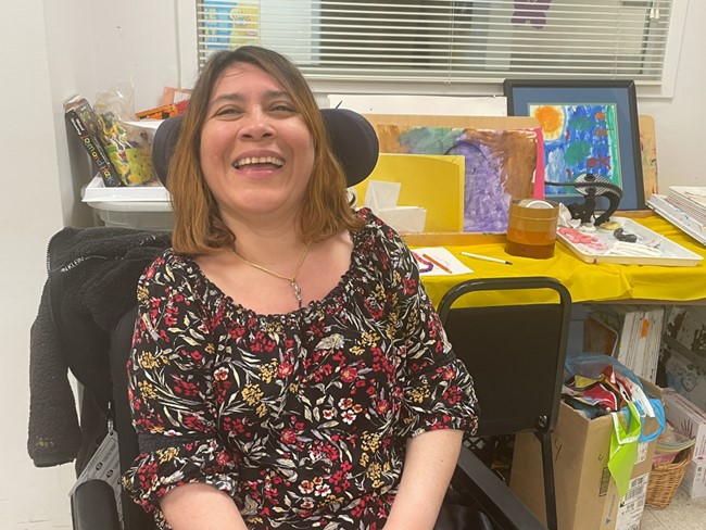 Each year, the Cerebral Palsy Associations of New York State present an art show during the annual conference. Each of the 24 affiliates is invited to submit the work of one artist from their organization. This year our artist is Maria Arriaga. She is a member of the Life Options program at CP Nassau and works with Art Therapist, Samantha Hasher.
