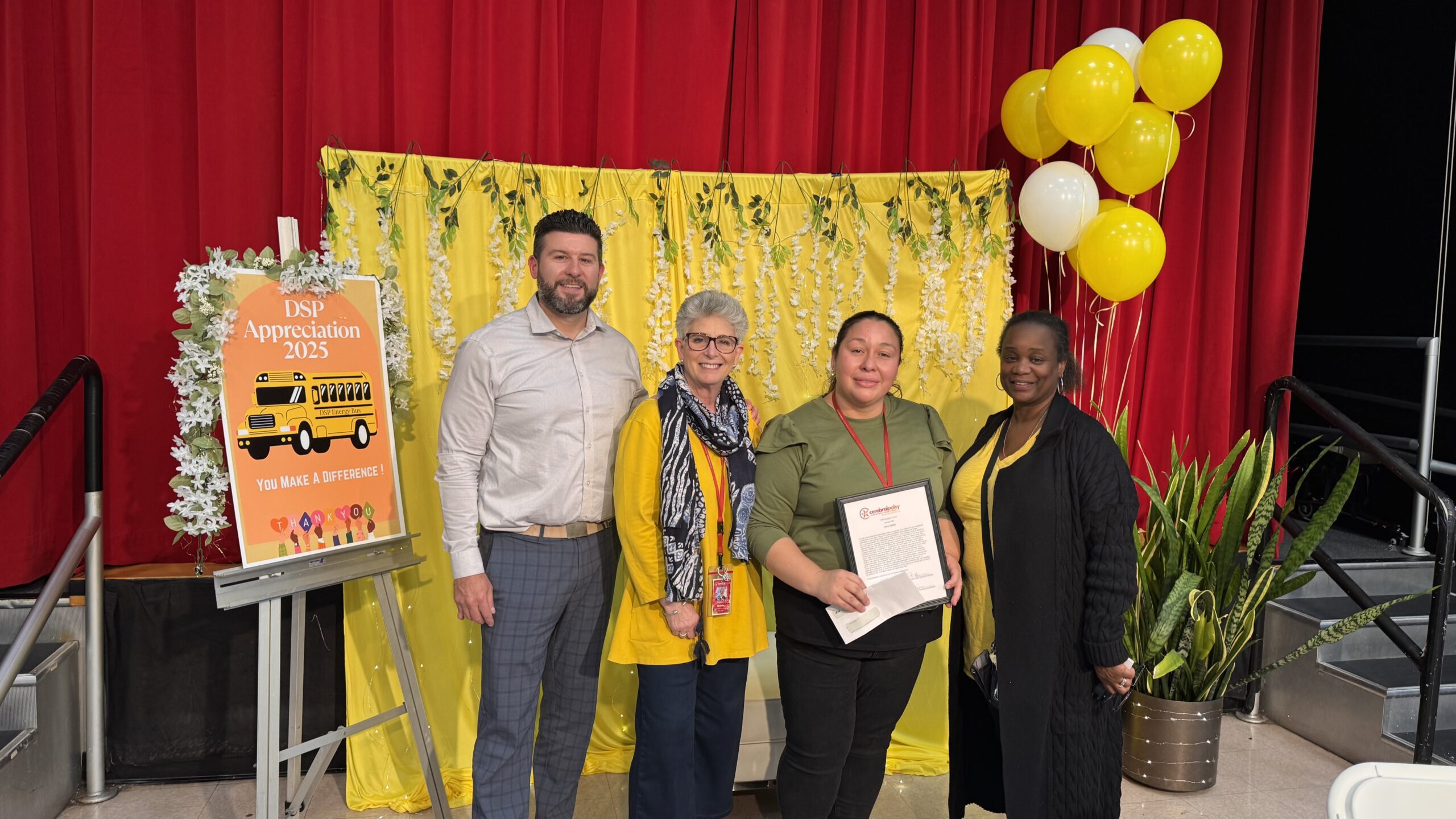 On Friday, October 24 a wonderful luncheon was held in the Auditorium at CP Nassau to thank and recognize the hard-working staff of direct support professionals here. The room was decorated so beautifully with fresh flowers and pretty photo back-drops, some of them featuring the “Energy Bus” theme that is promoting positive energy here at the Agency.